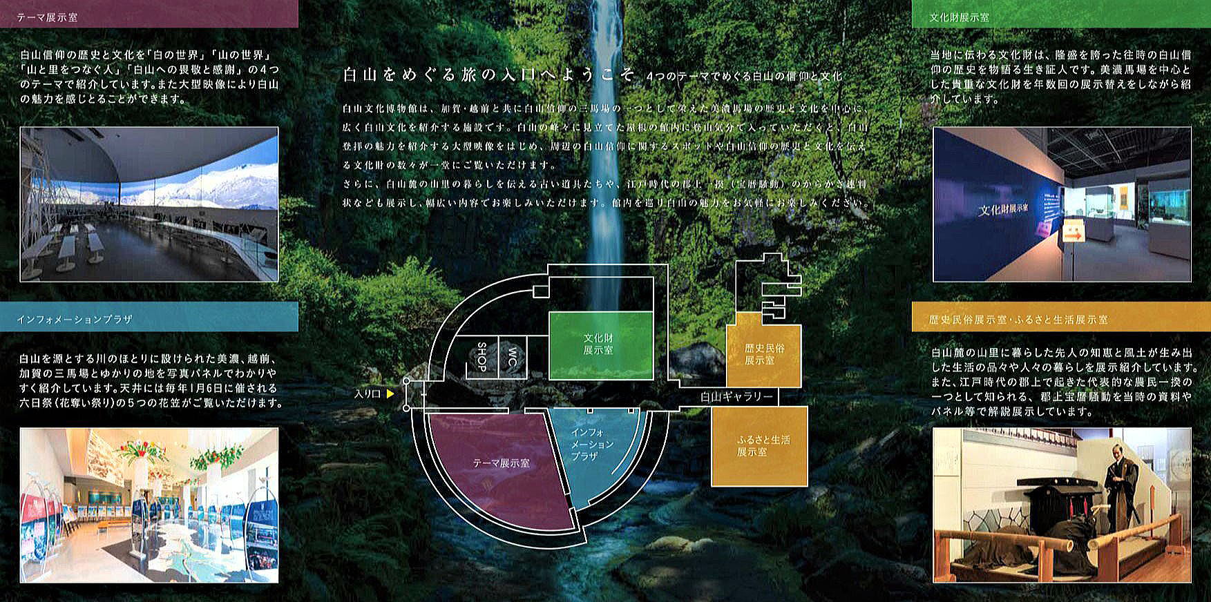 「白山文化の里」のシンボル施設として、白山をイメージした外観となっており、内部は白山に関する文化