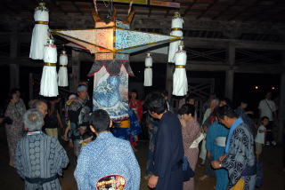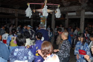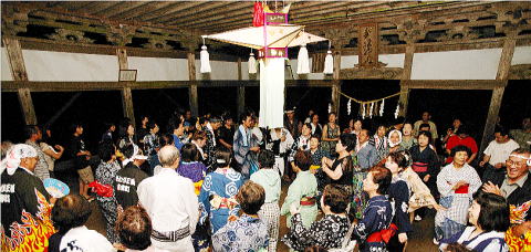 | 郡上市白鳥町は、岐阜県を流れる長良川の源流域に位置し、美濃馬場、白山中宮長滝 寺(現白山神社・長滝寺)を中心に、白山信仰とともに栄えてきた町です。そして、白鳥の 拝殿踊りは江戸時代の中頃から現在の白鳥町各地域において、お盆の時期に神社の境 内で踊られていたもので、今は、白鳥神社・野添貴船神社・前谷白山神社などに残るのみ となっています。夕刻、神社の拝殿には大きな切子灯籠が吊るされ、その明かりの下で踊 る素朴な踊りで白山の自然の恵みと信仰文化に培われた盆踊りです。 |